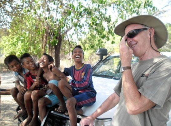 Sharing a joke with local lads at the south coast town of Suai.