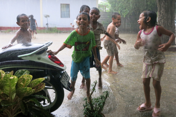 Children in front of our house celebrate the monsoon rains arriving after four months of no rain.